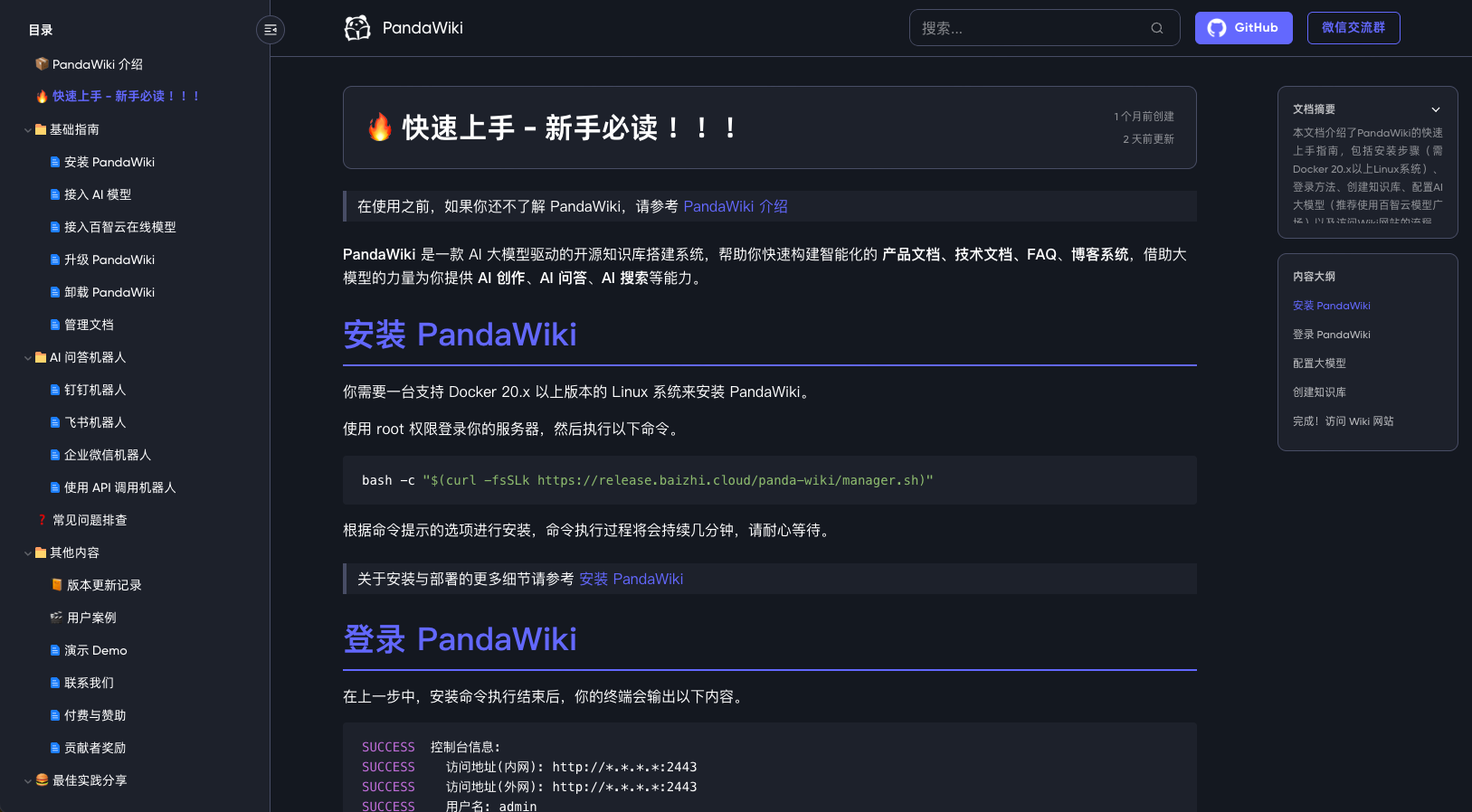 关于安装与部署的更多细节请参考 安装 PandaWiki。