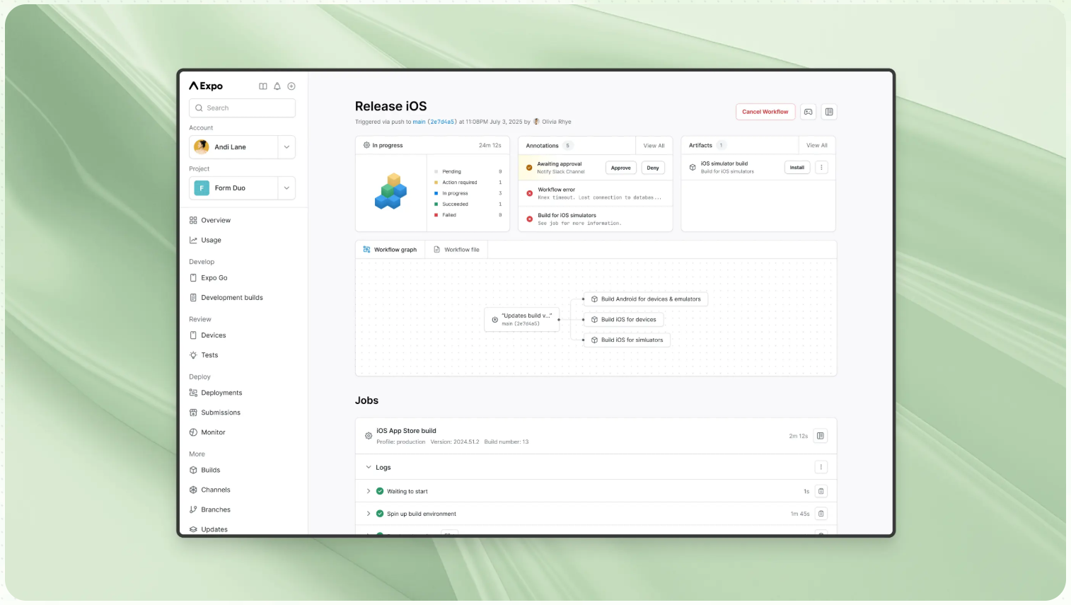 此代码库包含 Expo SDK、模块 API、Go 应用、命令行界面 (CLI)、路由器、文档以及其他各种支持工具。Expo 应用服务 (EAS) 是一个托管服务平台,与 Expo 开源工具深度集成。EAS 可帮助您以个人或团队身份构建、发布和迭代您的应用。