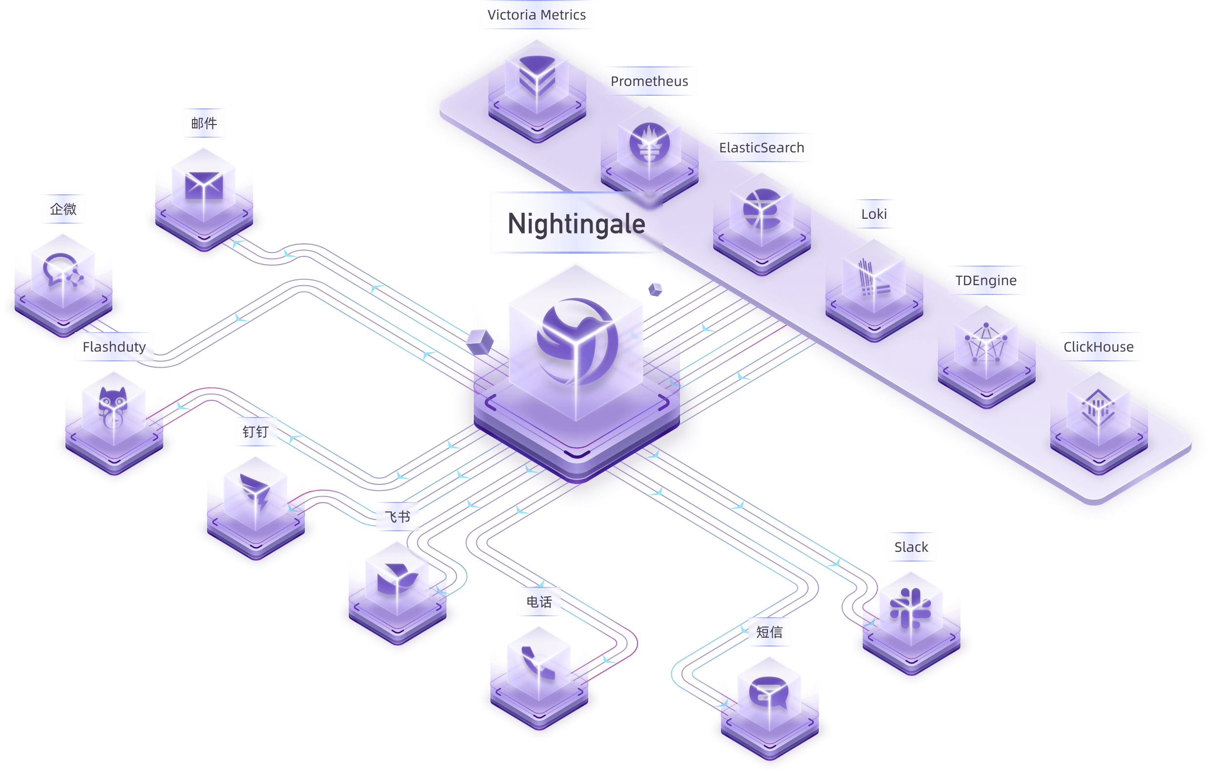 夜莺的侧重点是做告警引擎,即负责产生告警事件,并根据规则做灵活派发,内置支持 20 种通知媒介(电话、短信、邮件、钉钉、飞书、企微、Slack 等)。